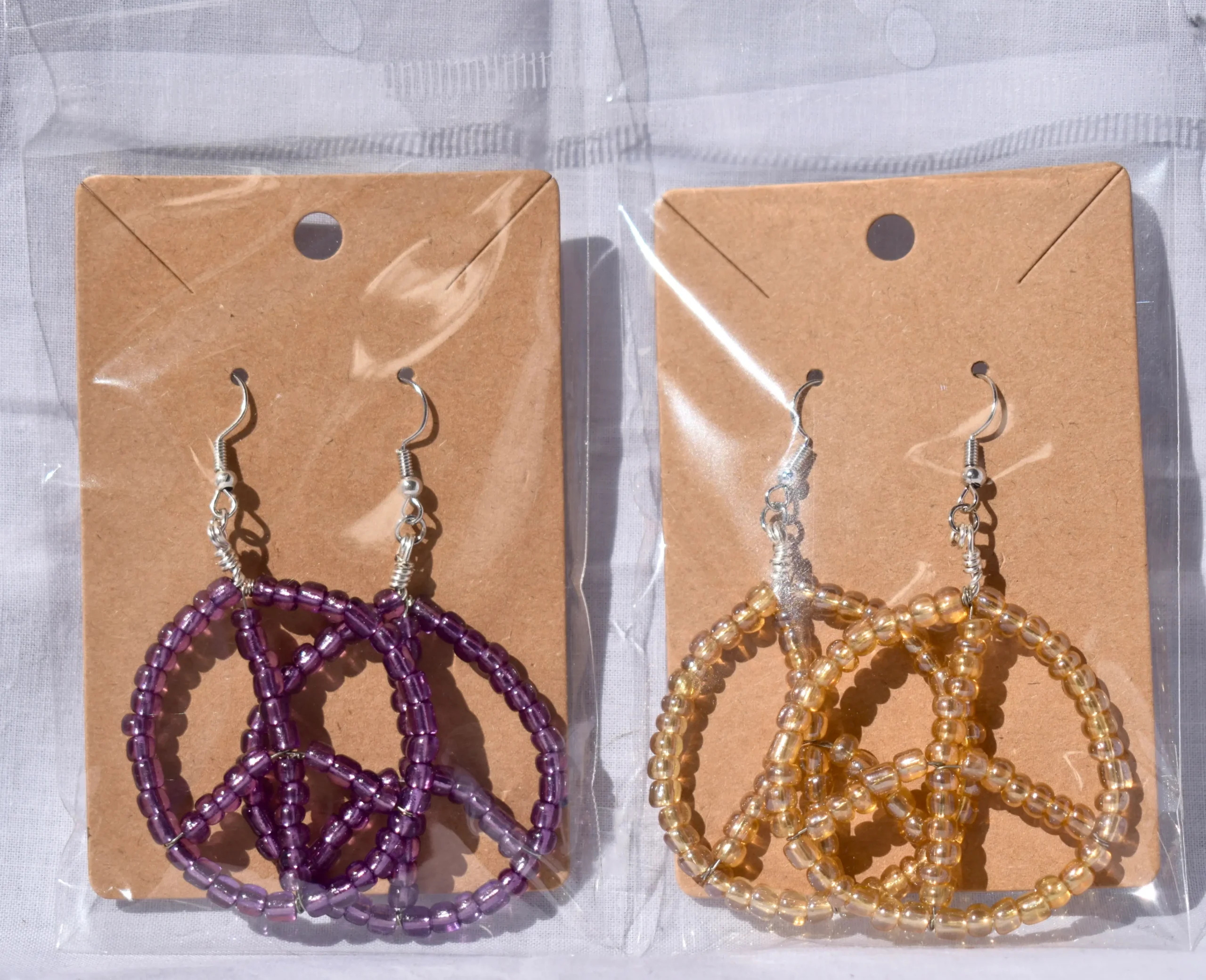 These gorgeous beaded earrings are hadn’t wrapped and beaded into a peace sign shape available in different colors